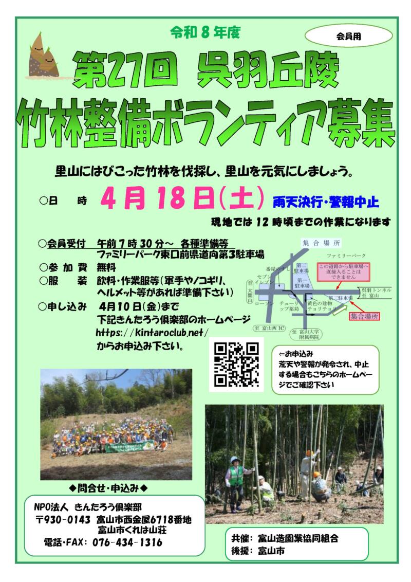 【申込】【令和8年度】第27回 呉羽丘陵 竹林整備ボランティア【各種準備から】(会員様向け)(4月18日)